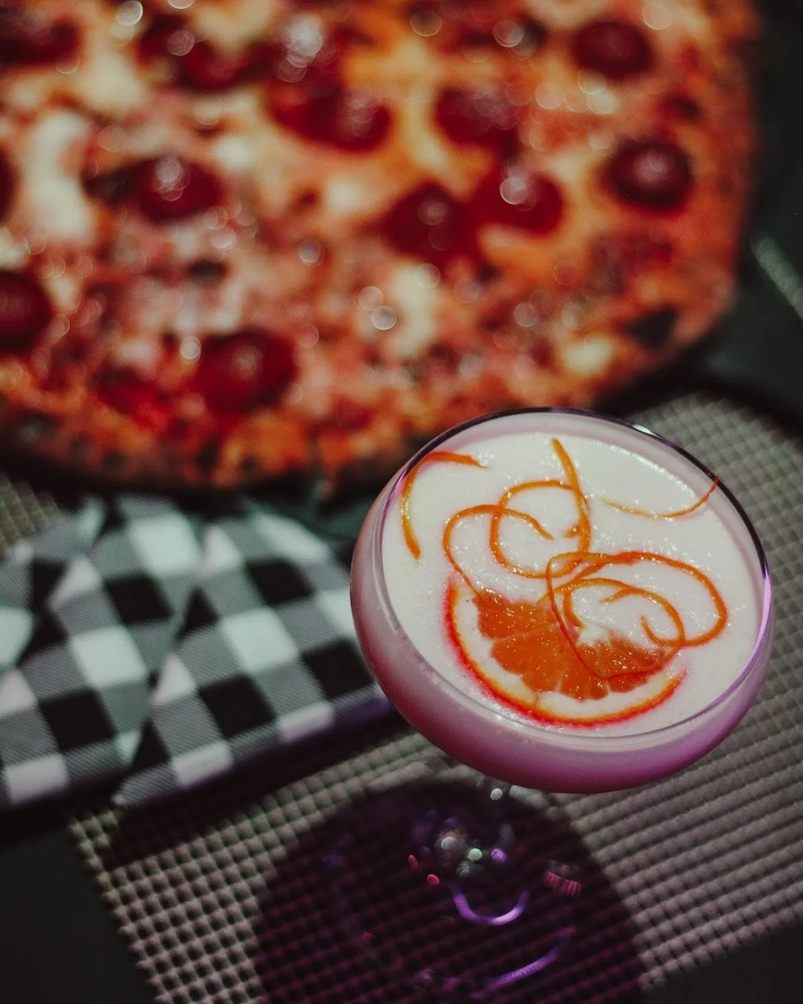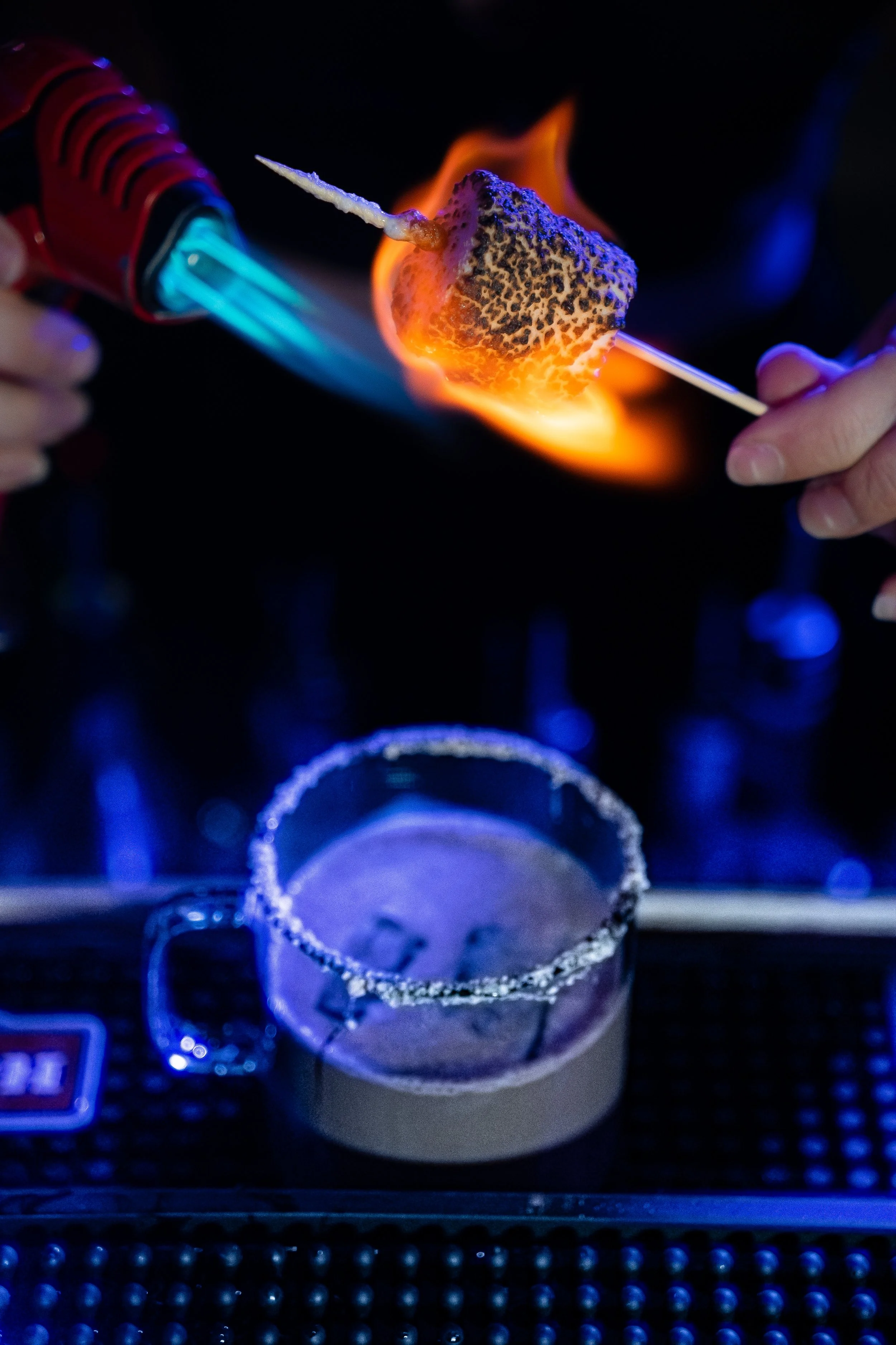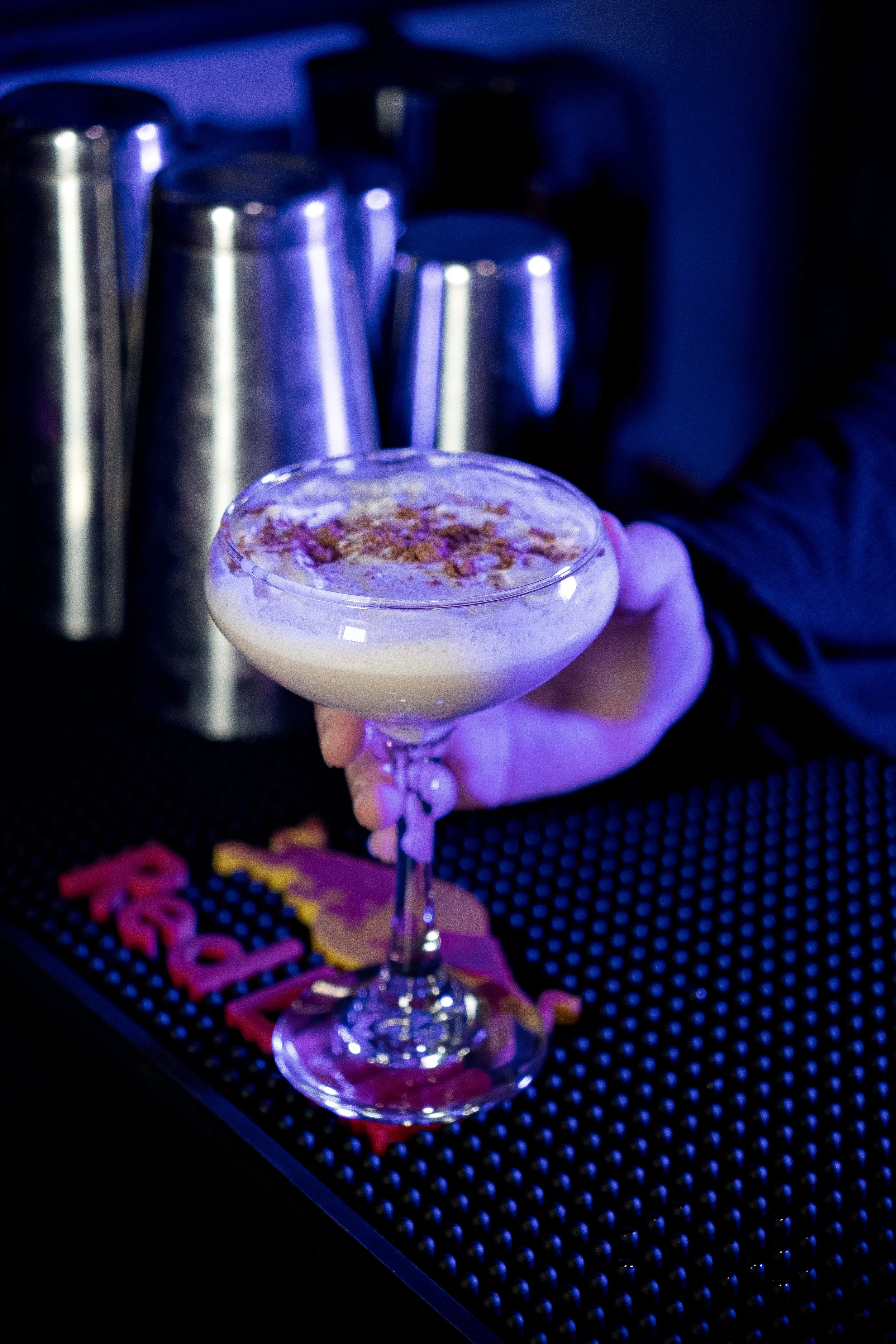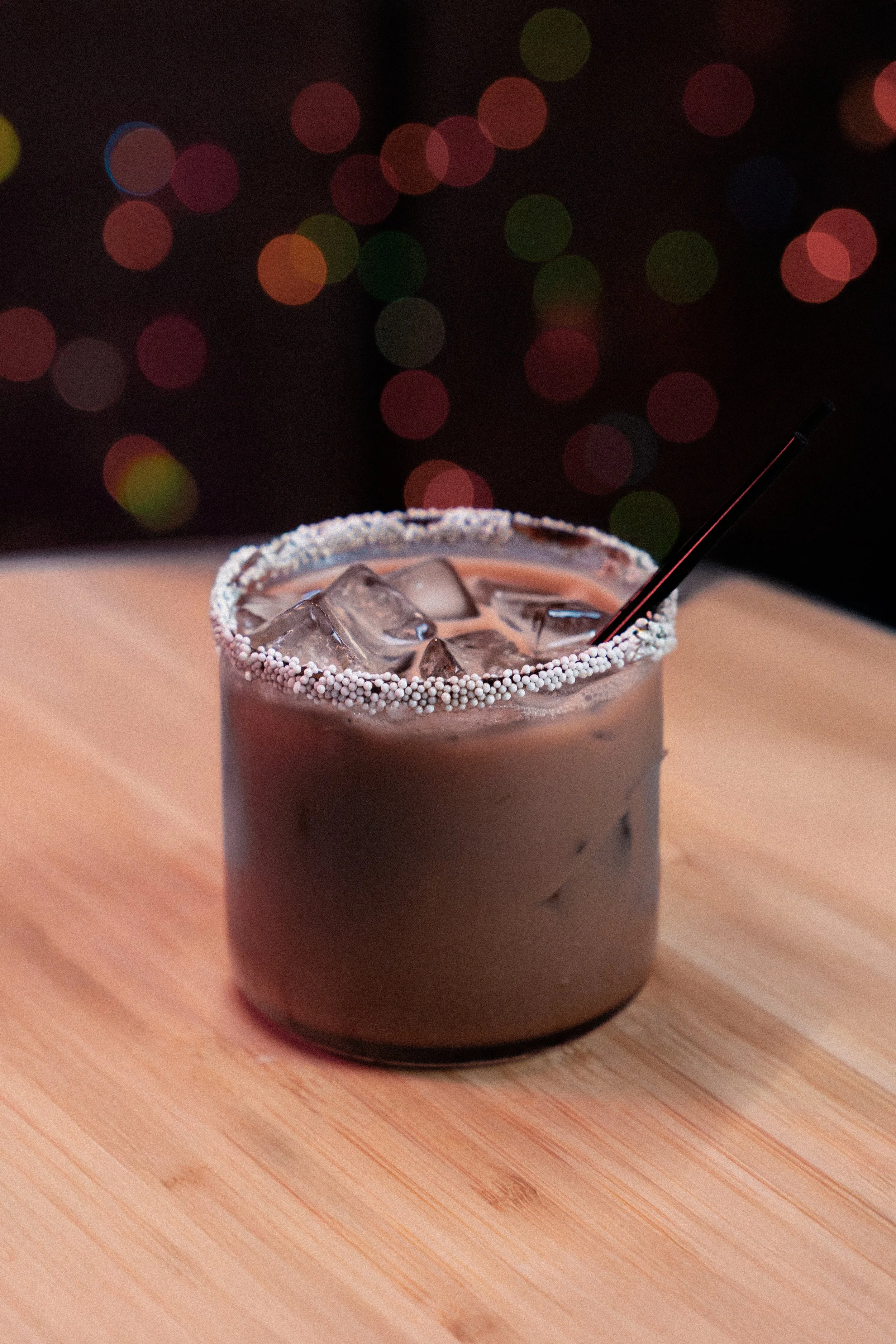 Chocolate vodka, Creme de Cocoa, Chocolot liqueur, black sesame syrup, snowcap sprinkle rim