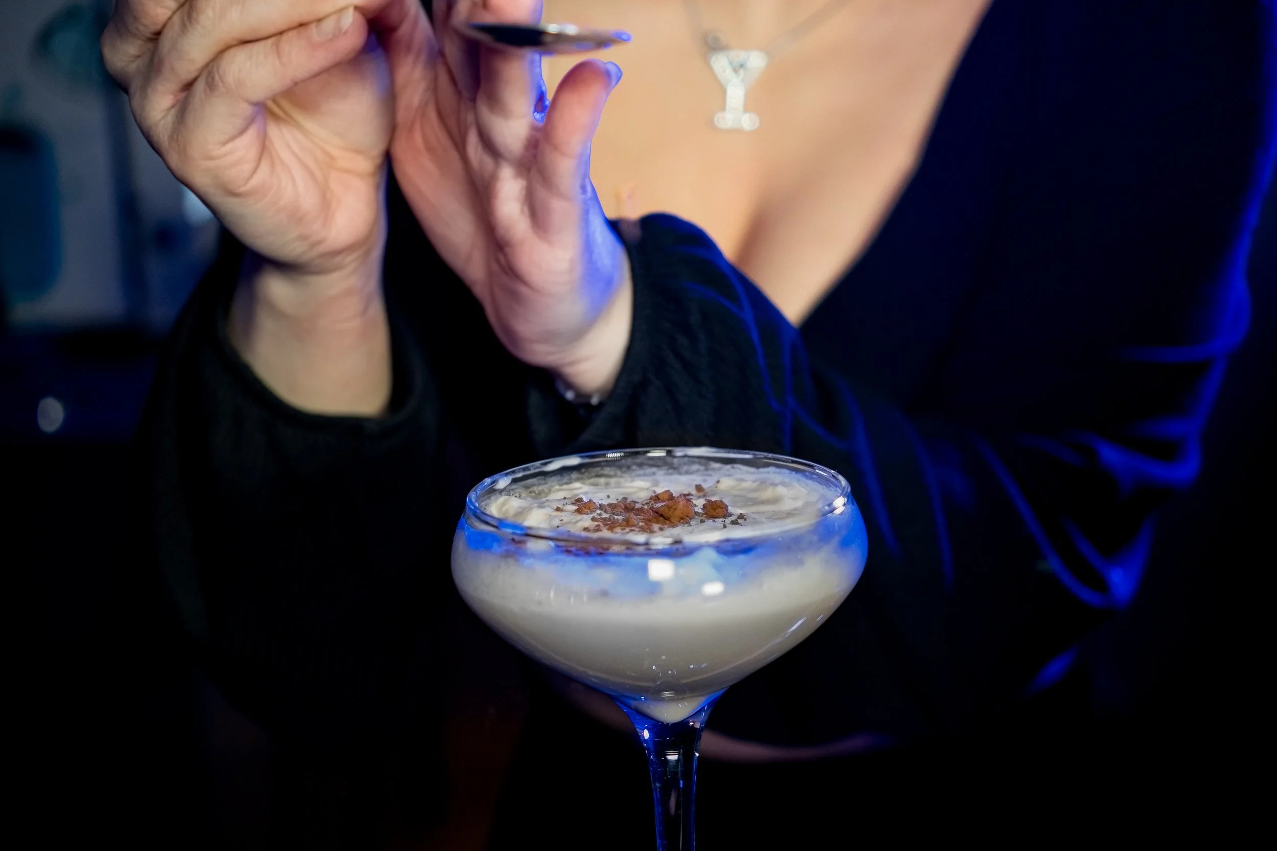 vanilla vodka, Rumchata, house clove syrup, house butterfly pea syrup
